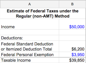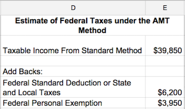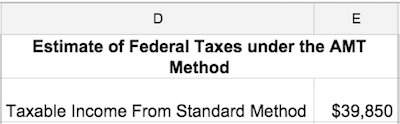 In columns D and E, Sam calculates her taxes under the AMT. Sam starts with her taxable income from the regular method, $39,850 in cell E2.
