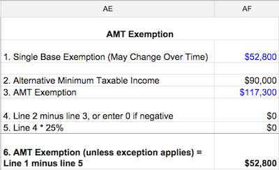 As the note at the top of the form says, if Sam’s income were at least $328,500, she’d receive no exemption. Sam’s income isn’t that high, so she continues with the calculation in columns AE to AF.