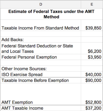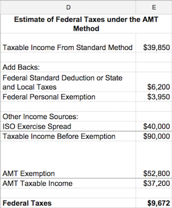 That income automatically populates cell E10 as the ISO exercise spread. That gives her an income of $90,000 for the AMT method.