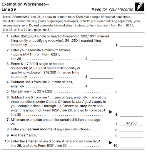 In columns AE to AF, Sam then calculates her AMT exemption, using the form on page 9 of the instructions.
