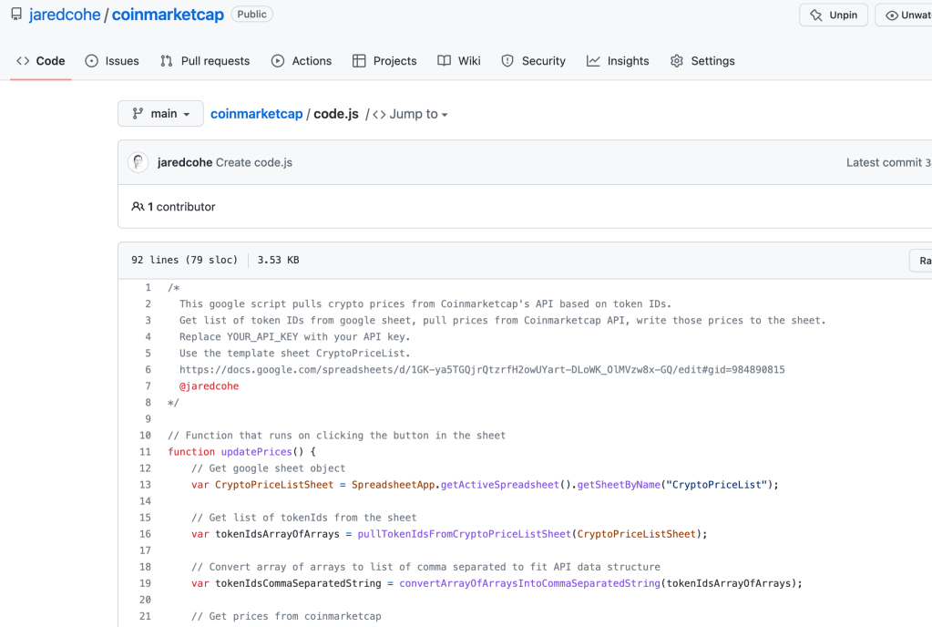 3. Create a Google Sheet where you want the prices to update, like this one. You can actually make a copy of that one and use it as your template. If you’re going to use this script, your Google Sheet does need to look like the sheet CryptoPriceList.